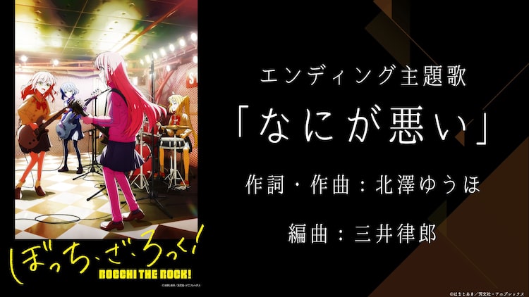 現在、TOKYO MXほかにて放送中の「ぼっち・ざ・ろっく!」。新たなエンディング楽曲となる「なにが悪い」は、作詞・作曲をthe peggiesの北澤ゆうほが手がけ、ボーカルは鈴代紗弓演じる伊地知虹夏が担当した。楽曲は各プラットフォームで配信中。北澤からのコメントも到着した。第8話の劇中曲「あのバンド」の配信もスタートしたほか、リリックビデオと劇中ライブ映像も公開。「あのバンド」には作詞で樋口愛、作曲で草野華余子、編曲で三井律郎が参加している。