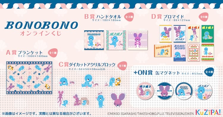 ラインナップされた景品はブランケット、ハンドタオル、ダイカットアクリルブロック、ブロマイド。購入者に抽選で缶マグネットが当たる+On Challengeも行われる。「ぼのぼの」に登場するキャラクターたちがカラフルな色彩かつ、どこかレトロなデザインであしらわれた。価格は1回税込770円。