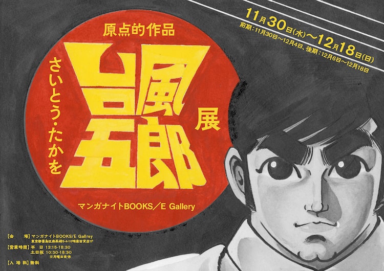 会場ではさいとう・たかをの“原点的作品”となる「台風五郎」の複製原画を展示および販売。また会場のデジタルギャラリーでは「台風五郎」のイラストカットなどが展示されるほか、施設内の書店では「台風五郎 新装版」を中心とした関連書籍が販売される。展覧会の前期は11月30日から12月4日、後期は12月6日から12月18日まで。