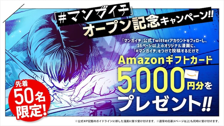 「#マンガイチ」は「すべての面白い漫画に対価とチャンスを」をコンセプトに設計された投稿サイト。投稿方法は「#マンガイチ」公式Twitterアカウント(@manga_ichi)をフォローし、ハッシュタグ「#マンガイチ」を付けてTwitterに作品を投稿するだけ。今回のキャンペーンでは正式オープンを記念し、16ページ以上のオリジナル作品を投稿した先着50人にAmazonギフトカード5000円分が進呈される。詳細は「#マンガイチ」の公式サイトおよび公式Twitterで確認しよう。