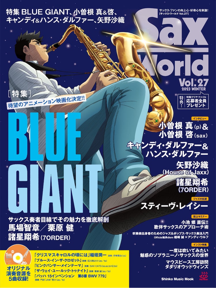 同誌では「BLUE GIANT」を表紙と巻頭で特集。サックス専門誌ならではの視点で、2023年2月17日に公開のアニメーション映画、そして原作の魅力を紹介する。インタビューでは7ORDERの馬場智章、諸星翔希が登場。またサックス奏者の栗原健による「原作マンガ『BLUE GIANT』を読む」という記事や、「サックス奏者および音楽マニアが自慢したい『BLUE GIANT』雑学集」と題し、使用楽器、登場人物、スポットなどを紹介するコーナーも設けられる。