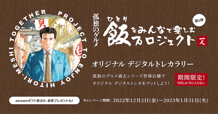 「ひとり飯をみんなで楽しむプロジェクト」の第1弾となる「『孤独のグルメ』オリジナル デジタルトレカラリー」は、「孤独のグルメ」の世界観を受け継ぎ、“ひとり飯”仲間を世の中に広げていこうとする企画。2023年1月31日までの期間中、「孤独のグルメ」シリーズに登場する10店舗で飲食し、店舗に設置された専用QRコードを読み取るとデジタルトレカがゲットできる。デザインは対象店舗ごとに異なり、各店舗とも12月と1月で違った種類のデジタルトレカが配布される。また12月15日には原作者の久住のトークライブを実施予定。そのほかにも「谷口ジローコレクション 孤独のグルメ」1・2巻セットや久住によるサイン入り複製原画が当たるプレゼント企画なども実施される。詳細は特設サイトをチェックしよう。