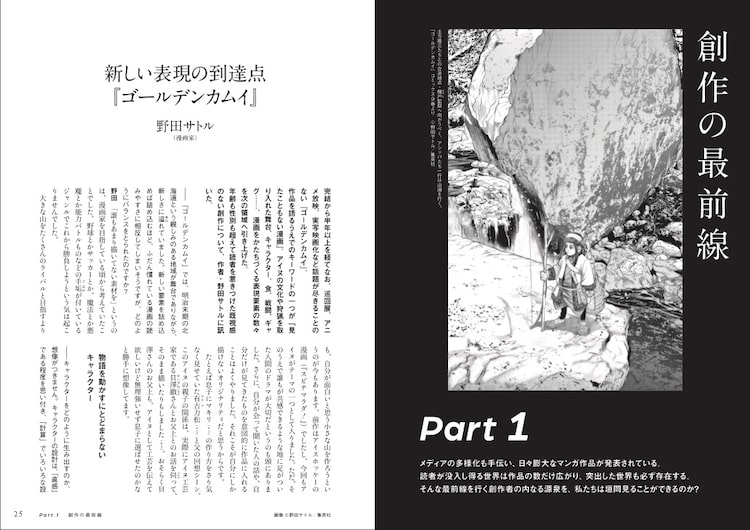 これからのマンガ、そしてマンガを取り巻く文化的環境はどのように進化していくのか、広い視点でマンガの現在地を考える「マンガの現在」。イントロダクションではエッセイスト・マンガ批評家のさやわかが、“マンガの「今」”について、最新の状況とその分析をまとめており、「Part1 創作の最前線」のコーナーには野田サトル、小林有吾、つくしあきひと、赤松健が登場している。野田は「ゴールデンカムイ」において年齢も性別も超えて読者を惹きつけた既視感のない創作について、小林は「アオアシ」をサッカーマンガの新領域に到達させた推進力について、つくしは「メイドインアビス」が読者を圧倒する理由についてそれぞれ語っており、参議院議員でもある赤松は、政治の内外から見た「マンガの現在」について話している。
