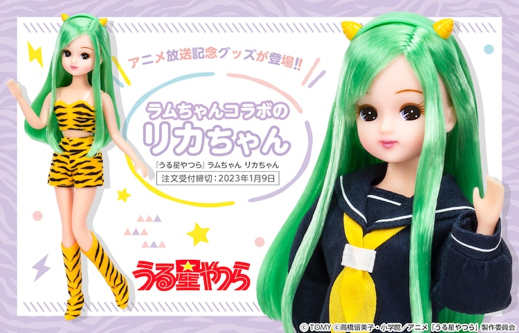高橋留美子原作によるTVアニメ「うる星やつら」と着せ替え人形のリカちゃんがコラボレート。「『うる星やつら』ラムちゃん リカちゃん」が、通販サイト・少年サンデープレミアムSHOPで発売された。価格は税込9900円。