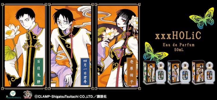 CLAMP「xxxHOLiC」より壱原侑子、四月一日君尋、百目鬼静をイメージした香水とミラースタンドがフェアリーテイルより発売される。
