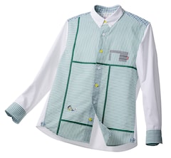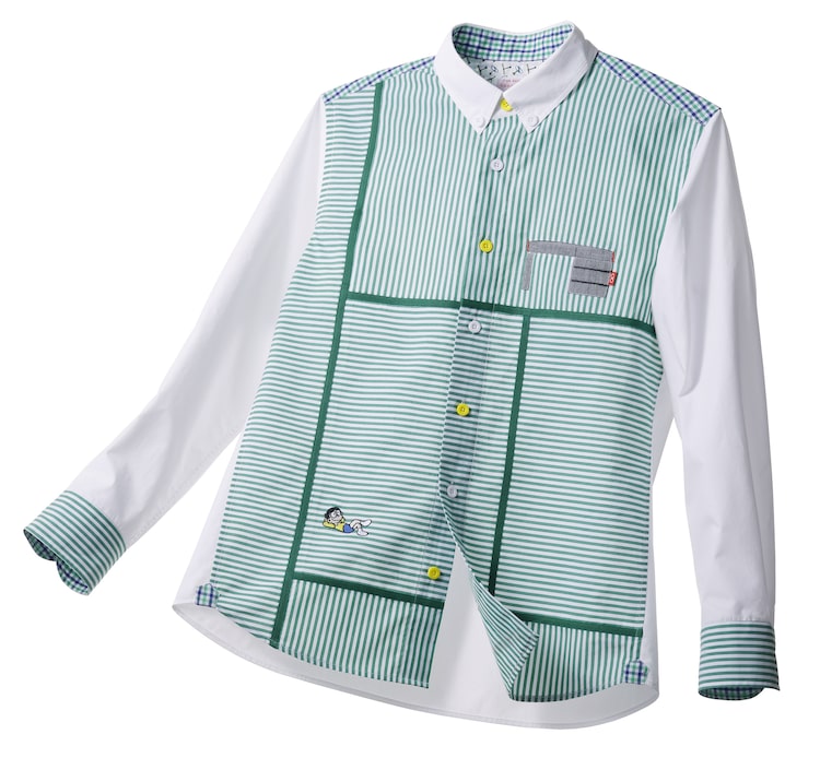 大人向けのカジュアルシャツの製作を得意とする河谷シャツに、小学館百貨店が依頼して開発した「Nobita’s room」。同商品はタイトルの通り、のび太の部屋をイメージしたシャツだ。前身頃はさわやかな緑のストライプとテープでのび太の部屋の畳を表現。背面は白とチェック柄でシンプルに仕上げられた。