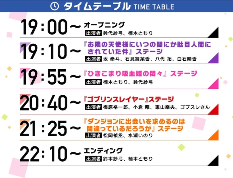 「お隣の天使様にいつの間にか駄目人間にされていた件」からは藤宮周役の坂泰斗、赤澤樹役の八代拓、白河千歳役の白石晴香が登場し、椎名真昼役の石見舞菜香がVTRで参加。「ゴブリンスレイヤー」からはゴブリンスレイヤー役の梅原裕一郎、女神官役の小倉唯、妖精弓手役の東山奈央、「ダンまち」からはベル・クラネル役の松岡禎丞、ヘスティア役の水瀬いのりが出演する。またアニメ作品以外では「ひきこまり吸血姫の悶々」のステージも用意されている。
