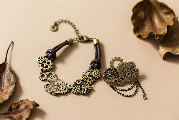 ブレスレットとブローチは、アプリ内に登場するスチームパンク映画「MECHANICAL LULLABY」にて、メンバーが演じたロボットドールをイメージしたもの。IDOLiSH7の7人、TRIGGERの3人、Re:valeの2人の全12種類が用意された。アンティーク調で統一されたアイテムには、歯車やねじ巻きがあしらわれ、ディティールの細部まで繊細に表現されている。
