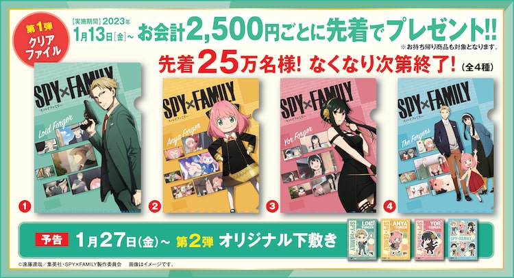 今回のキャンペーンでは、1月13日からの第1弾と1月27日からの第2弾の2回にわたり実施。会計額2500円ごとに、クリアファイルや下敷きなどのオリジナルグッズがプレゼントされる。また寿司皿5枚でできるゲーム「ビッくらポン!」で当たりが出ると、「SPY×FAMILY」のキャラクターをデザインしたラバーアクセサリーまたは消しゴムが手に入る。