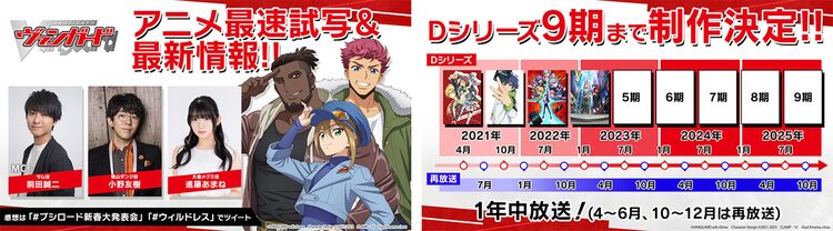 これは本日1月9日に東京・TOKYO DOME CITY HALLで開催されたイベント「ブシロード新春大発表会2023 第1部」で発表されたもの。“Dシリーズ”は2021年4月より放送された「カードファイト!! ヴァンガード overDress」に始まり、1月14日には「カードファイト!! ヴァンガード will+Dress Season2」の放送がスタートする。なおこれにより、アニメ「カードファイト!! ヴァンガード」の“Dシリーズは再放送含め2025年12月まで放送され続けることになる。