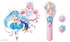 「変身スカイミラージュ」はペンライトをイメージした形状で、LEDを点滅させながら動かすことによって画像や文字を表現する“バーサライタ”を搭載。付属のスカイトーンを付け替えることで、球体に浮かび上がる光のアニメーションと変身音が変わり、それぞれのプリキュアのなりきり遊びが楽しめる。