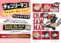 フェアでは大川ぶくぶが描き下ろした「チェンソーマン」のイラストを使用した新グッズを販売。アクリルスタンドや缶バッジ、マグカップや前髪クリップなどが登場した。さらに購入者には特典を用意。対象グッズを税込2200円購入するごとにホログラムステッカー全8種の中から1枚がプレゼントされる。