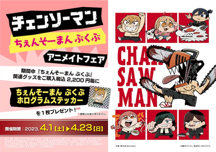 藤本タツキ原作によるTVアニメ「チェンソーマン」のフェア「『チェンソーマン』ちぇんそーまんぶくぶ アニメイトフェア」が、4月1日から23日までアニメイトで開催される。