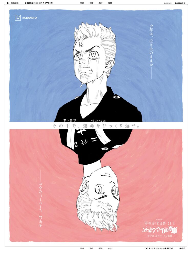 和久井健「東京卍リベンジャーズ」最終31巻が、本日1月17日に発売。朝日新聞朝刊には「運命をひっくり返す」をコンセプトにした1面広告が掲載されている。