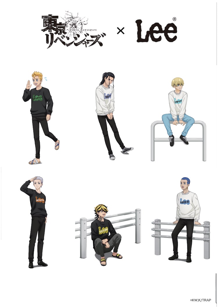 第2弾としてラインナップされたのは、花垣武道、場地圭介、松野千冬、三ツ谷隆、羽宮一虎、柴八戒の全6種。スプレープリントのLeeロゴに、各キャラクター名がラバープリントでデザインされ、背面の首元には卍マークの刺繍が施された。さらに第1弾で販売され、完売となった佐野万次郎モデルの再販売も決定している。