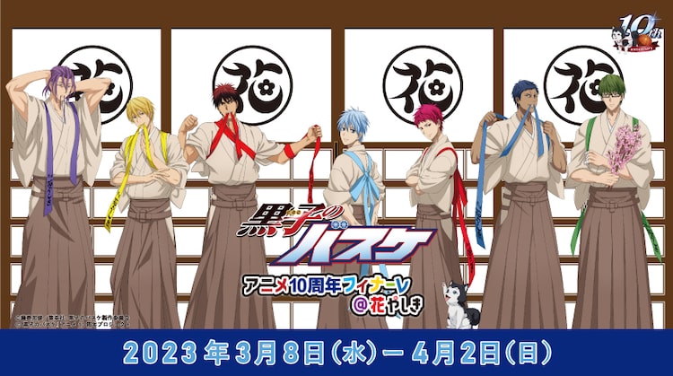 描き下ろしイラストには、10周年のお祝いをする準備のため袴にたすき掛けを行っている黒子テツヤら7人が登場。このイラストを使用したグッズの販売や、黒子と黄瀬の2人と一緒に遊んでいるような感覚で楽しめるアトラクションボイスなどが展開される。さらにイベントの最終日である4月2日には、通常営業の閉園後に「黒子のバスケ アニメ10周年後夜祭@花やしき」を開催。詳細は後日発表される。