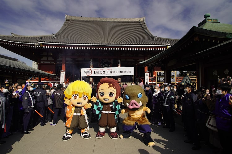 吾峠呼世晴原作によるアニメ「鬼滅の刃」の上映イベント「ワールドツアー上映『鬼滅の刃』上弦集結、そして刀鍛冶の里へ」を盛り上げる企画「雷門~浅草寺 鬼滅の刃 キャラクター着ぐるみ お練り」が、本日2月1日に東京・浅草で行われた。