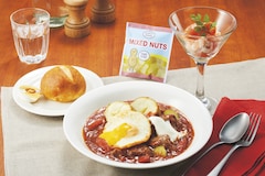 フードはフォージャー家をイメージした「SPY×FAMILY ビーフシチュー セット~フォージャー家 特製メニュー~」がパーク限定で登場。ヨルならではの少し崩れた目玉焼きが乗ったビーフシチューをメインに、料理上手のロイドをイメージしたカクテルグラスに入った前菜、アーニャの大好きなピーナッツが添えられた。