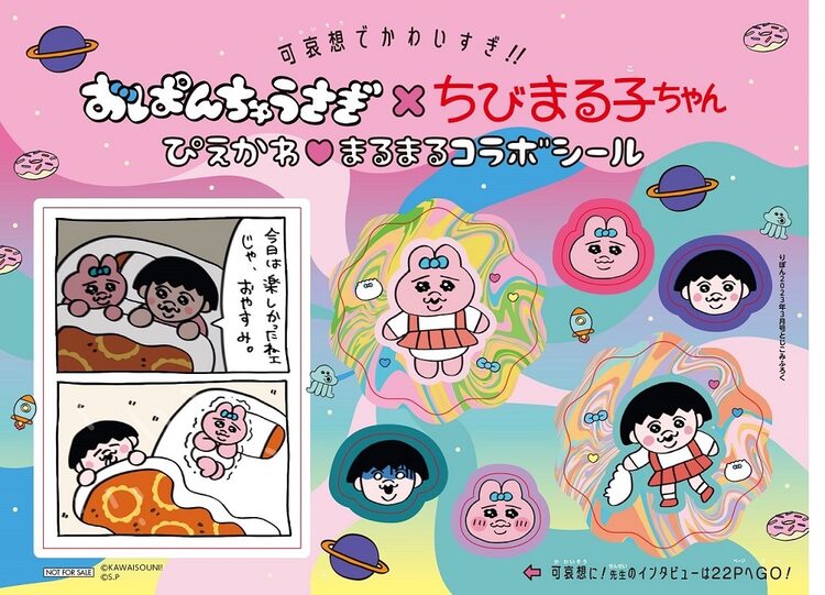 本日2月3日発売のりぼん3月号(集英社)に、さくらももこ「ちびまる子ちゃん」と、可哀想に!によるキャラクター・おぱんちゅうさぎのコラボシール「おぱんちゅうさぎ×ちびまる子ちゃん ぴえかわ まるまるコラボシール」が付録として綴じ込まれている。
