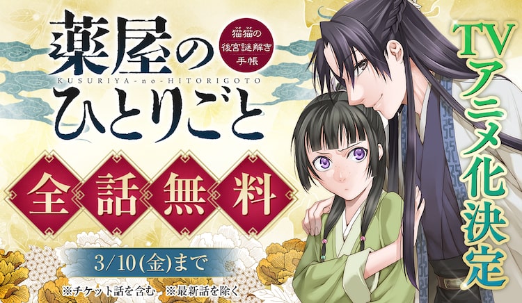 「薬屋のひとりごと~猫猫の後宮謎解き手帳~」全話無料公開のバナー。