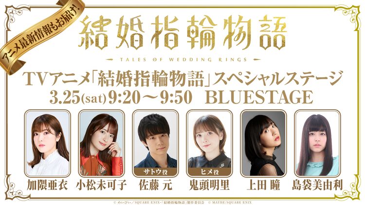 3月25日に東京・東京ビッグサイトで開催される「AnimeJapan 2023」内の「TVアニメ『結婚指輪物語』スペシャルステージ」に登壇する追加キャストが発表された。