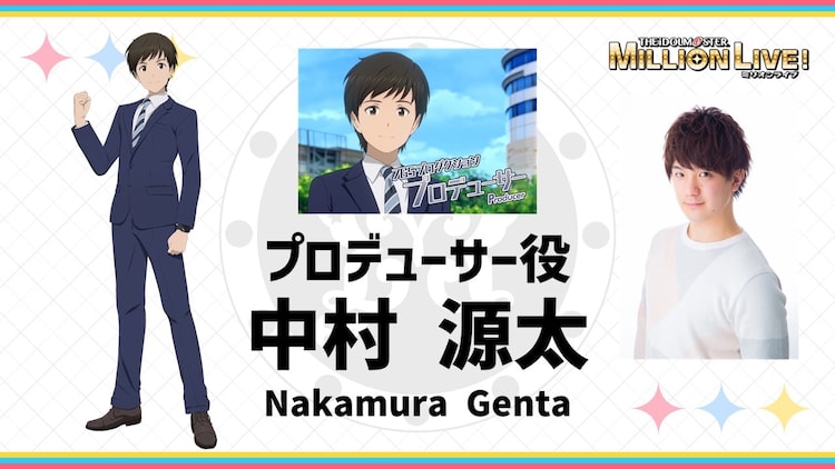 TVアニメ「アイドルマスター ミリオンライブ!」にて、プロデューサー役を中村源太が務める。