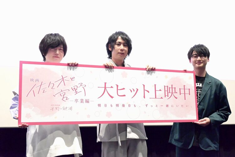 映画「佐々木と宮野ー卒業編ー」では受験を控え卒業を迎えようとしている佐々木秀鳴と、佐々木の卒業を意識する宮野由美が2人の時間を大切にしようとする様子などを丁寧に描写。初のアニメ化となる短編「平野と鍵浦」も同時上映されている。舞台挨拶には佐々木役の白井悠介、宮野役の斉藤壮馬、MCとして暮沢丞役の新井良平が登壇。早速映画の感想を聞かれた斉藤は、「映像的にも音的にも大きいスクリーンで楽しめる、劇場クオリティにふさわしい内容になっているのでは」と映画の出来栄えを褒める。新井が「TVアニメもすばらしかったけど、映画ではより光の表現がやわらかくなっていた」と続けると、白井も「光の表現が『佐々木と宮野』と『平野と鍵浦』とでは違う気がした」と同意した。