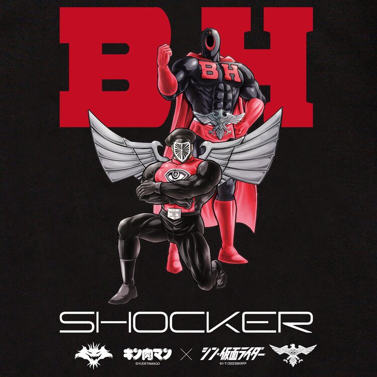 この描き下ろしイラストはグッズとして展開。商品化第1弾は「キン肉マン」オフィシャルグッズを展開するマッスルアパレルのTシャツだ。「SHOCKER」公式アプリ限定で「BLACK HOLE & SHOCKER CHOJIN」、KIN29SHOP-NEO ONLINEで「BLACK HOLE cooperating with the shocker ver.」「SHOCKER CHOJIN」がそれぞれ3月13日15時に発売。KIN29SHOP-NEO ONLINEの2商品は、KIN29SHOP各店でも後日販売される予定だ。