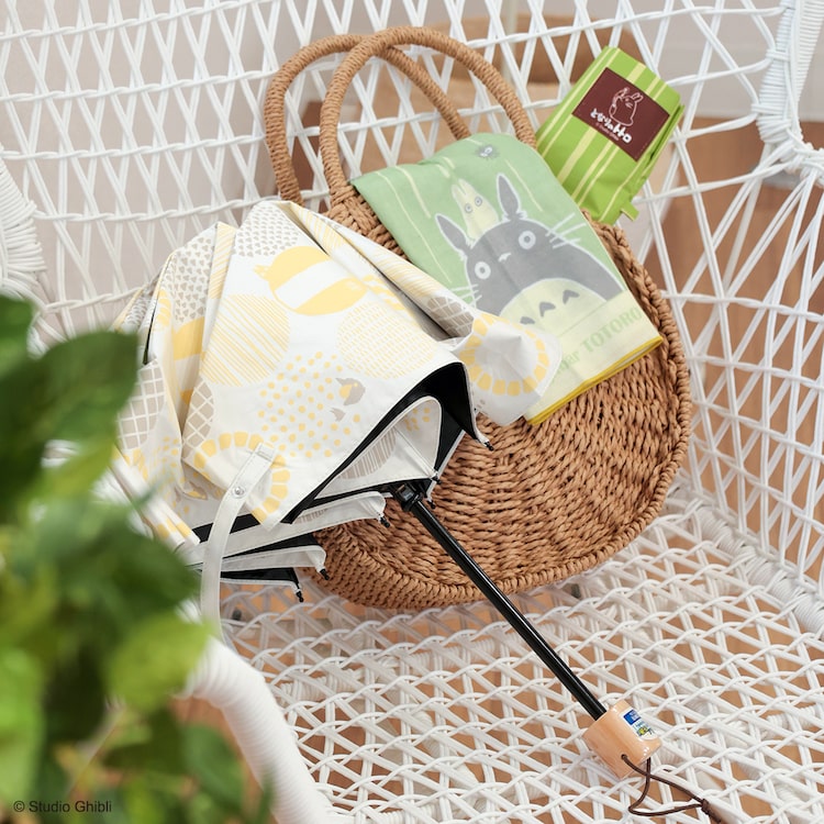 「となりのトトロ“とっておきとうもろこし”ギフトセット」は、とうもろこしの粒や大トトロたちをさりげなくデザインに落とし込んだ「晴雨兼用折り畳み傘」と、とうもろこしの皮をイメージしたストライプ模様にマックロクロスケや大トトロがデザインされた「大判ガーゼハンカチ」のセット。「おかあさんへ」の文字が刻まれたとうもろこしのタグ付きで配送される。