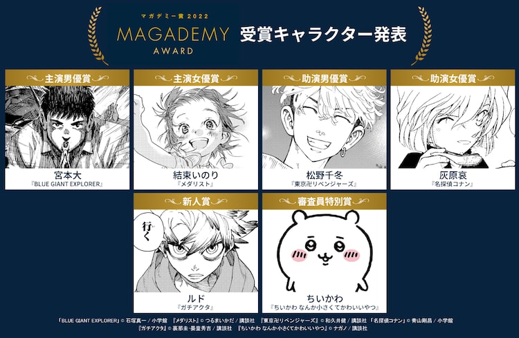主演男優賞は石塚真一「BLUE GIANT EXPLORER」より宮本大、主演女優賞はつるまいかだ「メダリスト」より結束いのりが受賞。助演男優賞には和久井健「東京卍リベンジャーズ」の松野千冬、助演女優賞には青山剛昌「名探偵コナン」の灰原哀が輝いた。また新人賞には裏那圭「ガチアクタ」よりルド、審査員特別賞にはナガノ「ちいかわ なんか小さくてかわいいやつ」よりちいかわが選ばれている。マガデミー賞の公式サイトでは審査員およびキャラクター自身からのコメントが掲載された。