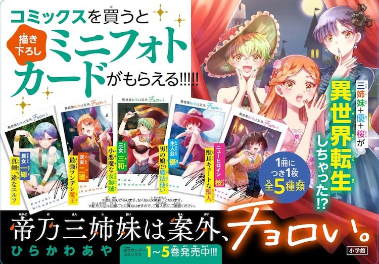 対象書店で「帝乃三姉妹は案外、チョロい。」の単行本を購入した人には、1冊につき1枚、全5種の「ミニフォトカード」をプレゼント。今回のカードには帝乃三姉妹だけでなく、主人公の優と、新たに登場したヒロイン・桜の5人が異世界転生キャラに変身した様子が描き下ろされた。配布方法などの詳細は書店により異なるため、詳細は最寄りの店舗にて確認しよう。