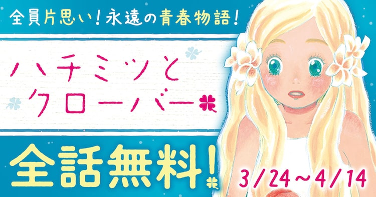 「ハチミツとクローバー」は、貧乏ながら楽しい生活を送る美大生・森田、真山、竹本の3人が、少女のように小さく可憐な女の子・花本はぐみと出会ったことから展開される青春群像劇。無料キャンペーンの期間は4月14日まで。1日で読める話数には限りがある。