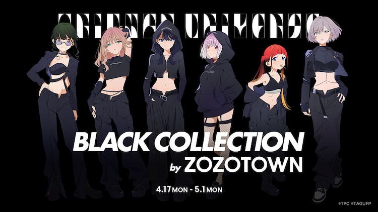 今回、コラボのための描き下ろしイラストを使用した限定アイテム計8型が登場。黒を基調とした衣装に身を包んだ宝多六花、新条アカネ、南夢芽、飛鳥川ちせ、2代目、ムジナのイラストをデザインしたカットソー、フーディ、アクリルスタンドとアクリルカードセット、クッションカバー、タペストリーなどがラインナップされた。