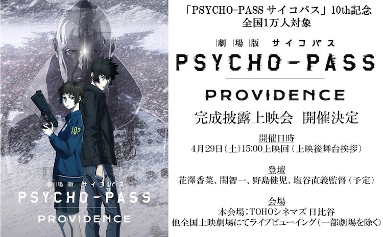 5月12日に全国公開となる「劇場版 PSYCHO-PASS サイコパス PROVIDENCE」。上映後に行われる舞台挨拶には、常守朱役の花澤香菜、狡噛慎也役の関智一、宜野座伸元役の野島健児、塩谷直義監督が登壇し、放送10周年を迎える「PSYCHO-PASS サイコパス」シリーズへの思いや、新作への意気込みなどのトークを繰り広げる。併せて一部劇場を除く全国の上映劇場で、イベントの模様のライブビューイングが実施されることも発表に。チケットぴあでは、本日4月14日から17日23時59分までチケットの抽選販売受付が行われる。