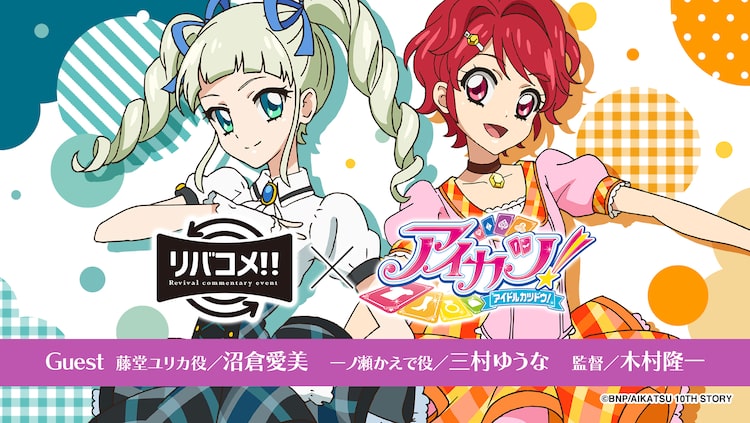 「リバコメ!!」は長きにわたって愛される作品をリバイバル上映し、ゲストの生コメンタリー付きで振り返るイベント。12回目の今回は、昨年10月に10周年を迎えた「アイカツ!」シリーズから、初代「アイカツ!」を取り上げる。第1部・第2部の2公演が行われ、事前の投票で上位になった話数を2本ずつ上映。ゲストの生コメンタリーに加え、トークショーやバラエティ企画なども展開される。話数投票は全178話が対象。5月8日18時まで専用フォームで投票を受付中だ。