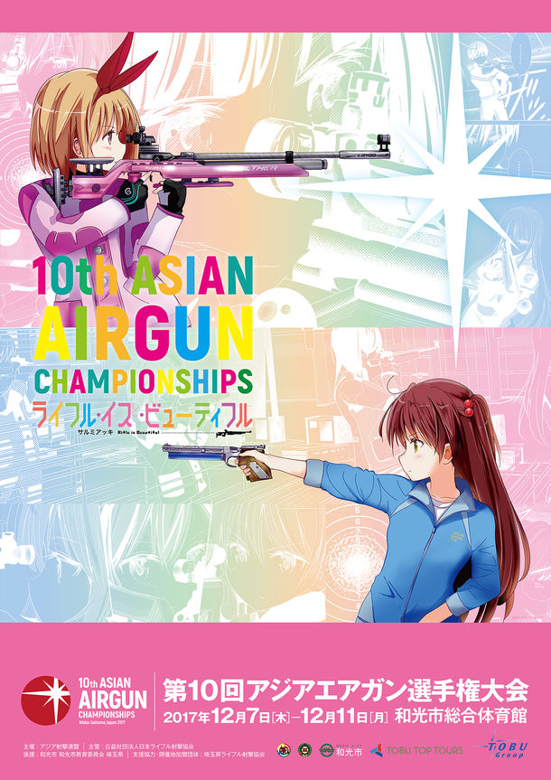 ポスターに使用されるイラストはサルミアッキによる描き下ろし。小倉ひかりがエアライフル、姪浜エリカがエアピストルを構えポーズを取っている。ポスターは明日11月25日から東武東上線の池袋、川越、志木、朝霞台 新越谷、和光市駅などに掲出。また東武東上線では、第10回アジア・エアガン選手権大会の中吊りポスターを掲出した車両が、12月10日まで運行されている。