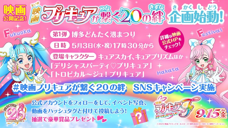 また、5月3日から5月9日にかけてSNSプレゼントキャンペーンを実施。映画公式Twitter(@precure_movie)、「ひろがるスカイ!プリキュア」公式Instagram(@precure_curesta)、プリキュア公式TikTok(@precure_official)いずれかをフォローし、「博多どんたく港まつり」に参加した際の写真や動画を、ハッシュタグ「#映画プリキュアが繋ぐ20の絆」を付けて投稿すると、抽選でプレゼントが当たる。