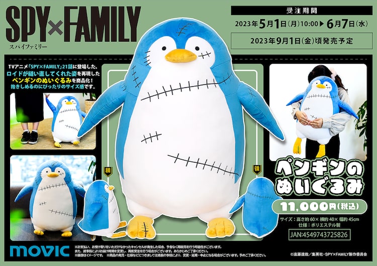 遠藤達哉原作によるTVアニメ「SPY×FAMILY」より、アーニャがロイドからプレゼントされたペンギンのぬいぐるみがグッズ化。受注生産で販売される。