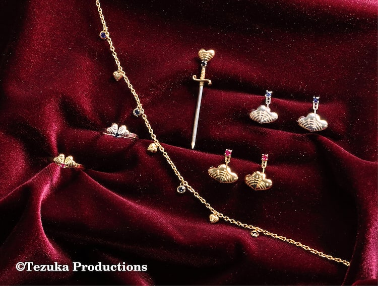 宝石専門情報メディア・KARATZ Gem Magazineを運営するKARATZとのコラボにより制作されたジュエリーは、リング、ピアス、ネックレス、ブローチの4種。「リボンの騎士」の主人公・サファイアが男の子と女の子の心を両方持って生まれたことから、ブルーサファイアで男の子の心が、ルビーで女の子の心が表現された。リングとピアスはサファイアの帽子にあしらわれているリボンがモチーフに。ネックレスはブルーサファイアとハートのパーツをつなげたデザインで、ブローチにはサファイアがいつも帯刀している剣の形がそのまま落とし込まれた。