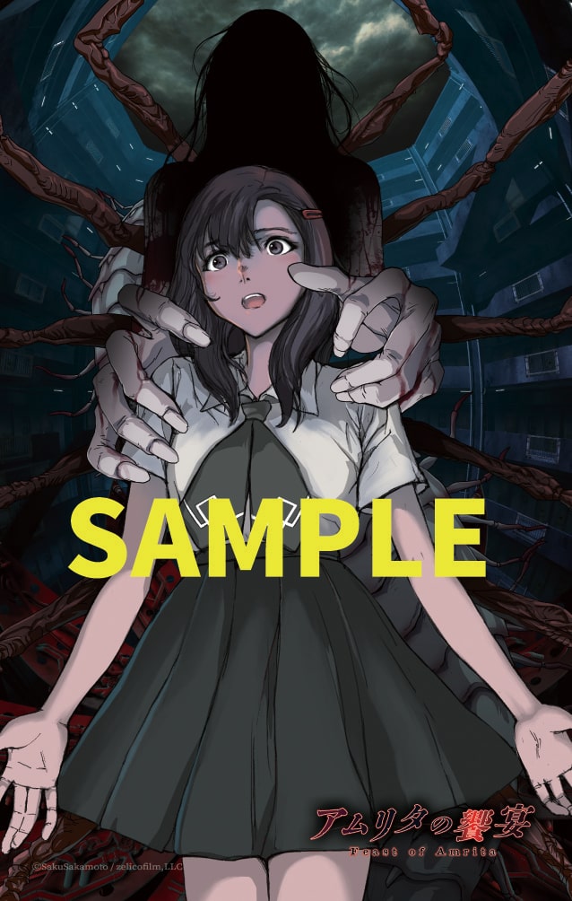 「アムリタの饗宴」は、2018年に公開された「アラーニェの虫籠」に続く坂本サク監督のオリジナル長編アニメ。内田真礼演じる女子高生のたまひが、下校途中に巨大集合住宅の屋上から人が飛び降りるのを目撃したことをきっかけに、巨大集合住宅内での奇妙な出来事に巻き込まれていく。5月26日より、花澤香菜が出演した「アラーニェの虫籠<リファイン版>」と同時上映で全国で順次公開される。また来場者プレゼントとして、坂本監督の描き下ろしイラストステッカーが配布されることも決定した。