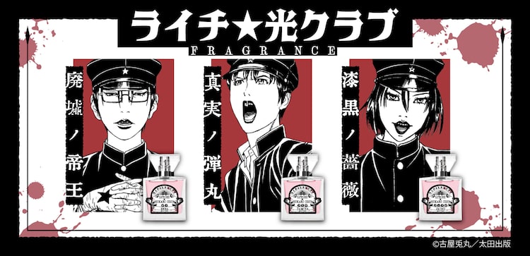 古屋兎丸「ライチ☆光クラブ」のキャラクターをイメージしたフレグランスが、primaniacsより発売される。フレグランスは「ゼラ」「タミヤ」「ジャイボ」の3種類。