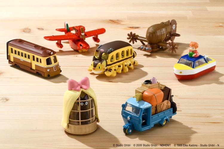 「魔女の宅急便」からは、ジジがぬいぐるみになりすまして鳥カゴに入るシーンを表現したトミカが登場。底面はタイヤ付きで、手で転がして走行させられる。「となりのトトロ」のトミカは、草壁家の引っ越しシーンに登場する、たくさんの荷物を運んだオート三輪。荷台に乗った自転車やバケツといった荷物が丁寧に再現されている。