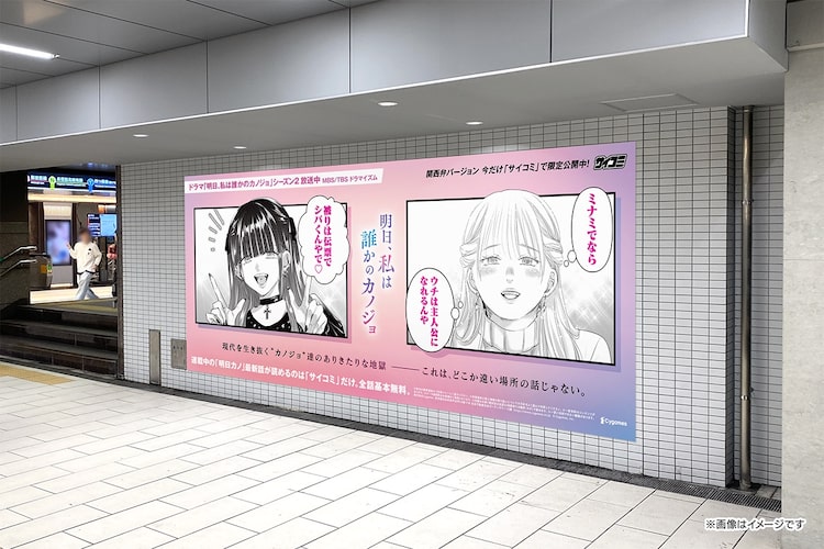 交通広告と連動し、マンガ配信サービス・サイコミでは「明日、私は誰かのカノジョ」の関西弁バージョンを6月30日まで公開中。51話、63話、85話、117話、126話、145話を対象に、本編のセリフがすべて関西弁に変換されている。