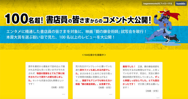 映画「鋼の錬金術師」の公式サイトに掲載されている書店員からのコメント。 (c)2017 荒川弘/SQUARE ENIX (c)2017映画「鋼の錬金術師」製作委員会