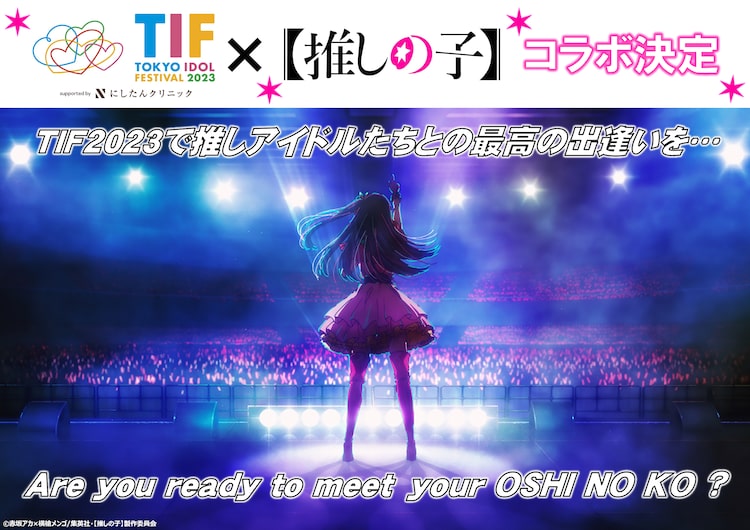 赤坂アカ横槍メンゴ原作によるTVアニメ「【推しの子】」と、8月4日から6日にかけて東京のお台場・青海周辺エリアにて開催されるアイドルフェス「TOKYO IDOL FESTIVAL 2023」のコラボが決定した。