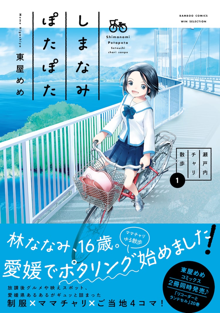 「しまなみぽたぽた 瀬戸内チャリ散歩」は、東京から愛媛の今治市に引っ越してきた女子高生ななみが、ママチャリで気ままに散歩するポタリング部に入部したことから始まる物語。親の都合で引っ越しをさせられ「もう必要最低限しかがんばりたくない」と、ななみは考えていた。がんばりたくないのに身体を動かす自転車なんてと思っていたが、ゆったりと景色を見ながら自分のペースで移動ができて、映えスポットも美味しいお店も回れて、橋を使って隣の島にも行けると、ポタリング部の活動に惹かれていく主人公をたっぷりの愛媛あるあるとともに描く。メロンブックス、まんが王、COMIC ZIN、啓文社、明屋書店、宮脇書店には購入特典が用意されている。