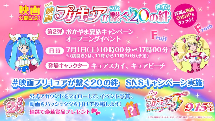 「映画プリキュアオールスターズF(エフ)」公開と「プリキュア」シリーズ20周年を記念した企画「映画プリキュアが繋ぐ20の絆」が展開中。その第2弾として、「ひろがるスカイ!プリキュア」のキュアスカイ、「フレッシュプリキュア!」のキュアピーチが、7月1日に岡山県で開催される「おかやま夏旅キャンペーン」オープニングイベントの“桃開き”に参加する。