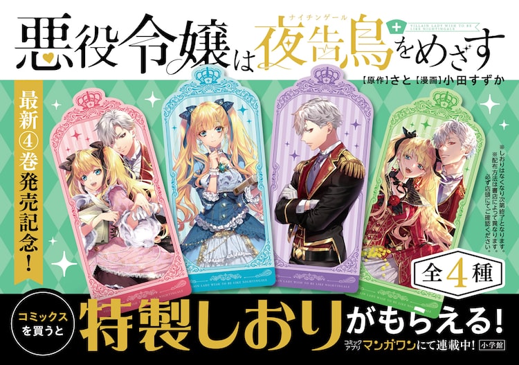 「悪役令嬢は夜告鳥をめざす」4巻発売、全4種のしおりもらえる書店フェア 2023年6月19日2023年6月19日 editor 「悪役令嬢は夜告鳥をめざす」のしおりがもらえるフェアの告知画像。さと原作による小田すずか「悪役令嬢は夜告鳥をめざす」4巻が、本日6月19日に発売された。これを記念し、全国の対象書店ではしおりがもらえるフェアが順次展開されている。 用意されたしおりは全4種。フェア参加書店で「悪役令嬢は夜告鳥をめざす」の単行本を1冊購入するごとに1枚、しおりがプレゼントされる。配布方法などの詳細は店舗により異なるため、詳細は店頭で確認しよう。 関連記事ABCアニメーションが音楽事業を開始、「週刊ラノベアニメ」のOP&EDを手がける松本零士「ニーベルングの指環」完全版全4巻 第4部「神々の黄昏」は初単行本化「かのかり」第4期、桜沢墨との旅を感じさせる“デートビジュアル”第4弾公開「4年制不老不死」吸血鬼の暇つぶし、それは4年ごとにいろんな大学のサークルに入ること「プリンセス・プリンシパル」第4章、4週目までの来場者特典情報公開 舞台挨拶も劇場版「名探偵コナン」金ローで3週連続放送 「100万ドルの五稜星」本編ノーカット Tweet 関連コミック 悪役令嬢は夜告鳥をめざす