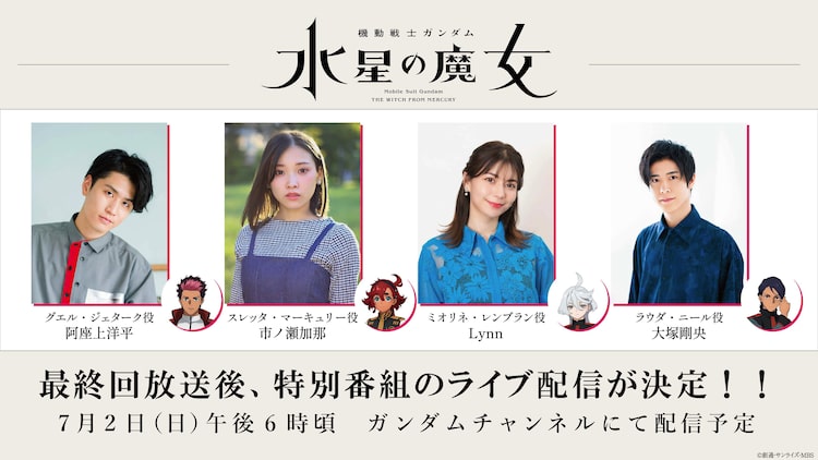 TVアニメ「機動戦士ガンダム 水星の魔女」最終話の放送後にあたる7月2日18時頃より、YouTubeのガンダムチャンネルにて、キャストが出演する特別番組のライブ配信実施が決定した。