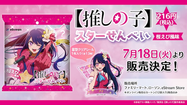 「【推しの子】スターせんべい 桜えび風味」には、星型クリアシール全13種の中から、ランダムで1枚が付属。星型クリアシール全13種には、アイ、アクア、ルビー、かな、MEMちょのイラストを使用したノーマルシール10種、アイ、アクア、ルビーのイラストがデザインされたオーロラ加工のレアシール3種が用意された。商品はなくなり次第終了。eStream Storeでは、1箱12個入りのカートン販売のみ行われる。